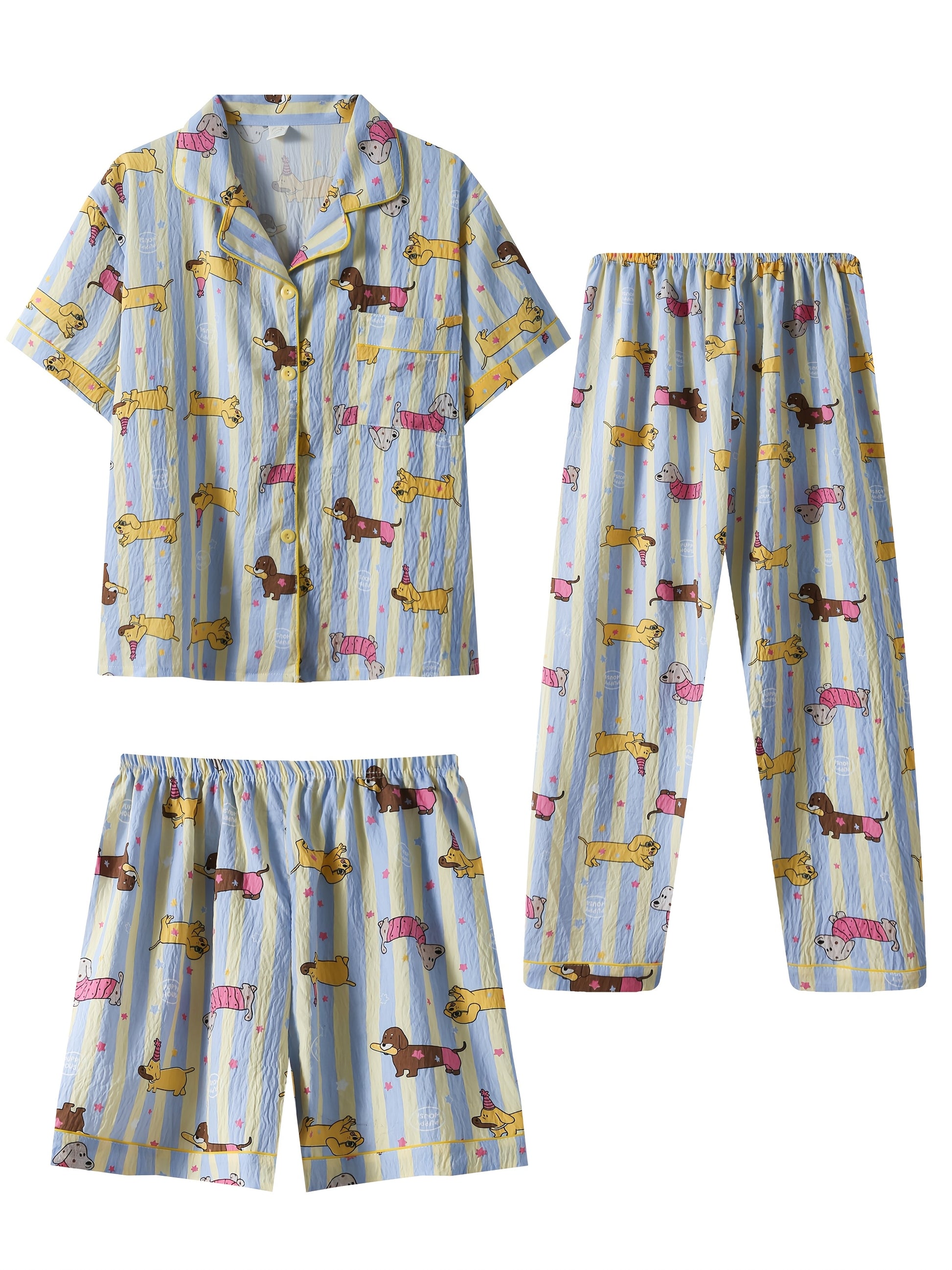 Unwind in ultimate comfort with this adorable 3-in-1 pajama set featuring cute dachshund dog prints on pastel yellow and blue stripes. πΆππ