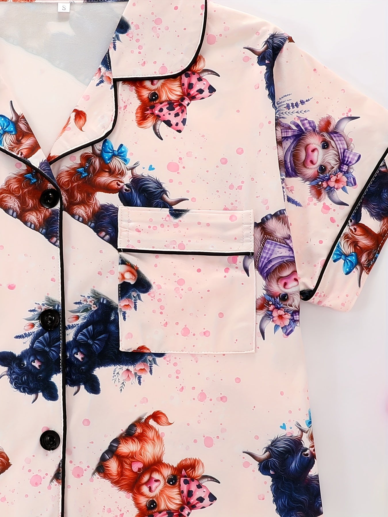 Bring a touch of cuteness to your bedtime routine with this 3-piece cartoon cow print nightwear set, including a short-sleeve button-up shirt, relaxed shorts, and full-length pajama pants. The soft peach base is beautifully decorated with adorable cartoon cows wearing bows and surrounded by butterflies, making it a playful and cozy choice for both lounging and sleeping.